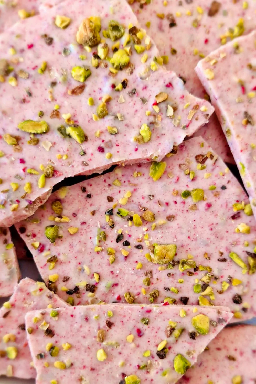 A white chocolate based bark with roasted pistachios and tangy freeze dried raspberries.